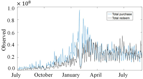 https://tianchi.aliyun.com/competition/entrance/231573/information (accessed on 1 March 2024). The dataset consists of four parts: basic user information data, user subscription and redemption data, the yield table, and the interbank lending rate table. This paper mainly uses the user subscription and redemption data table and the yield table, which records the operation of 28,000 users over 427 days. The operation record includes three parts: subscription, redemption, and yield information, and the unit of the amount is 0.01 yuan. The data has been desensitized to ensure safety, whilst the following calculation ensures there will be no negative value: Today’s Balance = Yesterday’s Balance + Today’s Subscription − Today’s Redemption.