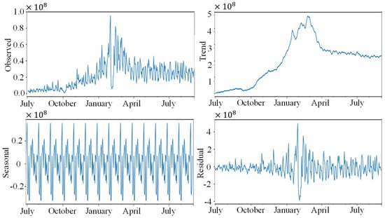 37] is a time series decomposition algorithm based on local weighted regression, and can achieve favorable decomposition results for periodic data. The STL algorithm decomposes periodic time series data into three components: (1) the low-frequency component reflects the trend component in the data, and represents the trend and direction of the data; (2) the periodic component refers to the high-frequency component in the data, representing the repetitive patterns of change over time in the data; and (3) the remainder refers to the remaining components of the original sequence after subtracting the trend and periodic components, including the noise components in the sequence. Specifically, the original sequence can be decomposed into three components as given in Equation (14):