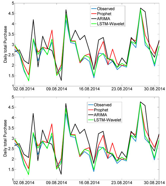 2 and root mean square error (RMSE) values of the proposed model are the highest, whereas the Prophet model also has a median model performance especially for the redeem and purchase data. The main reason for this is that the ARIMA time series model assumes stationary series modeling, whereas stock data has characteristics such as nonlinearity, non-stationary, and high noise. Whereas the wavelet decomposition decomposes the data into simpler structures and more obvious data trends, the proposed model can predict stock prices well. Moreover, due to the excellent ability of LSTM to extract detailed features, the proposed model applies the LSTM model to the hierarchical modeling of wavelet coefficients. Based on the characteristics of each layer’s coefficients, the total prediction results can be obtained through data fusion, resulting in more accurate prediction results and avoiding the overfitting problem.