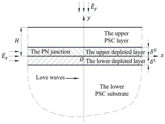 Based on the above research findings, it is known that the geometric thicknesses of PN junctions are usually on the order of micrometers. PN junctions often have physical properties that differ from those of bulk PSC materials. For example, the steady-state charge carrier concentrations in PN junctions show a gradient distribution. When the geometric sizes of the bulk PSC material are also on the order of micrometers, the PN junctions will have a significant impact on the propagation performance of high-frequency and short-wavelength elastic waves inside the bulk PSC materials. This happens to reflect the interface effect originating from the PN junctions in PSC materials, according to the Gurtin–Murdoch theory [23,24,25]; that is, the boundary conditions with imperfect interface parameters can be used to describe the discontinuous relationships of wave motion quantities on both sides of the interface [26,27]. Therefore, based on the above research content, this paper further proposes the theoretical model of interface effect originating from the PN junction and studies its influence on the propagation characteristics of Love waves in a PSC semi-infinite medium. First, considering the coupling mechanical displacement, electric potential, and charge carrier perturbation, it is mathematically derived that the basic equations of a PSC semi-infinite medium in Section 2, which consists of a lower PSC substrate, an upper PSC layer, and a PN junction, i.e., homo- or hetero-junction, that appears at the interface between these two regions. Two biasing electric fields are further considered in the basic equations of the lower n-type PSC substrate, which provides evident influence on the physical properties of the Schottky junction. Then, based on the Gurtin–Murdoch theory [24,25,26] and through the spectral method [28,29,30,31], two equivalent mathematical models are established to investigate the dispersion and attenuation characteristics of Love waves. Finally, based on the above two equivalent mathematical models, the numerical results of the dispersion and attenuation curves of shear horizontal waves are provided in Section 5. After that, the conclusion remarks are given in Section 6.