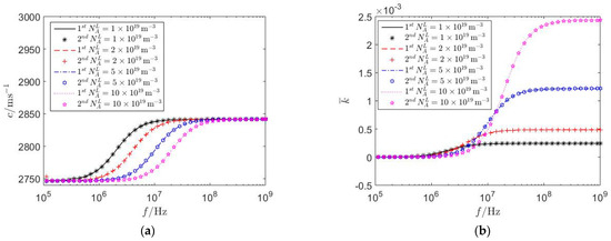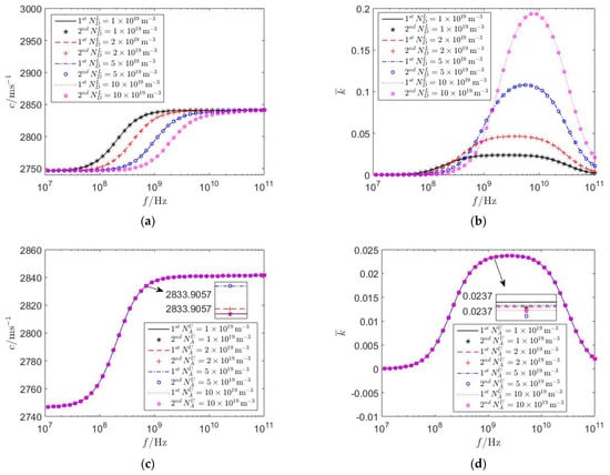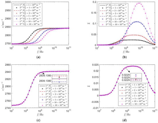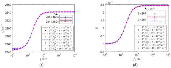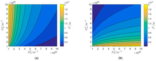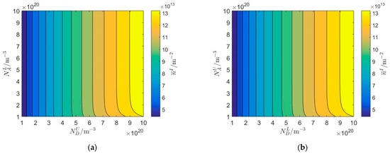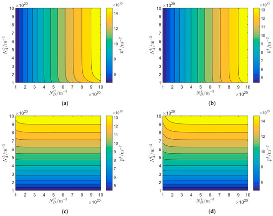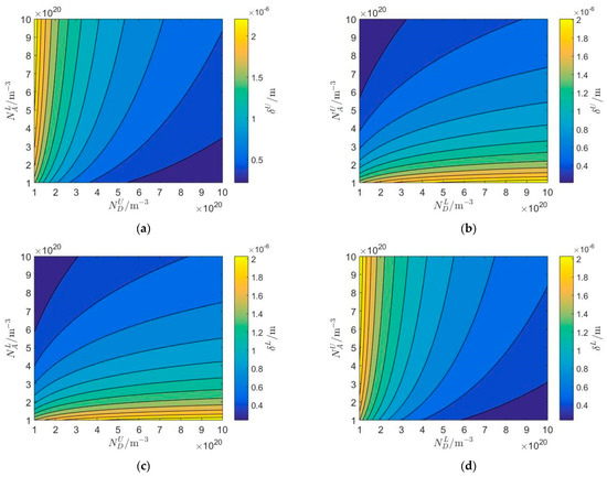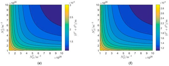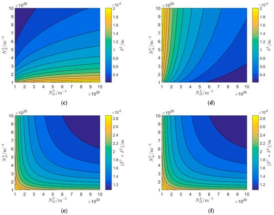 In this sub-section, the influence of the homo-junction on the dispersion and attenuation characteristics of Love waves, which appears in the PSC semi-infinite mediums for the combinations of upper n-type ZnO/lower p-type ZnO and upper p-type ZnO/lower n-type ZnO is systematically discussed. The thickness of the upper n-type or p-type ZnO layer is . Figure 2 and Figure 3 show the numerical distributions of steady electron and hole carrier concentrations and geometrical thicknesses of the depleted layers and homo-junction with the variation in the donor and acceptor concentrations. It is observed from Figure 2a–d that the numerical distribution of is dominated by the donor concentration in the upper n-type ZnO layer or lower n-type ZnO substrate, while the numerical distribution of is dominated by the acceptor concentration in the lower p-type ZnO substrate or upper p-type ZnO layer. With an increase in the donor and acceptor concentrations, the numerical values of and likewise increase. The mathematical reason for the above numerical results can be seen in Equations (33) and (34) that and are obtained by definite integrations with respect to and , which are dominated by the donor and acceptor concentrations in the upper ZnO layer and lower ZnO substrate, as shown in Equations (2) and (4). Since the upper layer and lower substrate are both ZnO, the numerical distributions of in Figure 2e,f are approximately symmetrical with respect to the line and , respectively. It is further observed from Figure 3a–d that the numerical distribution of is dominated by the donor or acceptor concentration in the upper ZnO layer, while the numerical distribution of is dominated by the acceptor or donor concentration in the lower ZnO substrate. However, with an increase in the donor and acceptor concentrations, the numerical values of and likewise decrease, which means that an increase in the donor and acceptor concentrations brings the homo-junction closer to an interface. The mathematical reason for the above numerical results can be seen in Equations (3) and (5) that the donor or acceptor concentration in the upper ZnO layer and acceptor or donor concentration in the lower ZnO substrate is in the denominator of the mathematical expressions for and , respectively.