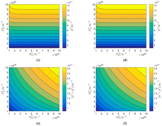 Numerical distributions of steady electron and hole carrier concentrations of the homo-junction with the variation in the donor and acceptor concentrations. (a,b) the steady electron carrier concentration; (c,d) the steady hole carrier concentration; (e,f) the total charge carrier concentration; (a,c,e) upper n-type ZnO/lower p-type ZnO; (b,d,f) upper p-type ZnO/lower n-type ZnO.