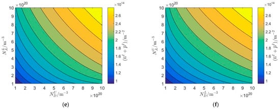 Numerical distributions of steady electron and hole carrier concentrations of the hetero-junction with the variation in the donor and acceptor concentrations. (a,b) the steady electron carrier concentration; (c,d) the steady hole carrier concentration; (e,f) the total charge carrier concentration; (a,c,e) upper n-type Si/lower p-type ZnO; (b,d,f) upper p-type Si/lower n-type ZnO.