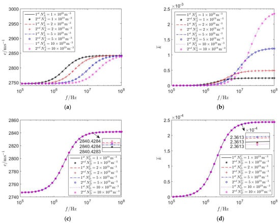 for the combination of upper p-type ZnO/lower n-type ZnO. The discrete numerical points are calculated using the second mathematical model, which falls approximately on the continuous curves. It is observed that the variation in acceptor or donor concentration in the lower ZnO substrate has an evident influence on the dispersion and attenuation curves of Love waves, as shown in Figure 4a,b and Figure 5a,b, while the variation in the donor or acceptor concentration in the upper ZnO layer has negligible influence on the dispersion and attenuation curves of Love waves as shown in Figure 4c,d and Figure 5c,d. This means that the influence of the homo-junction on the dispersion and attenuation characteristics of Love waves mainly comes from the lower depleted layer in the lower ZnO substrate. When the frequencies of Love waves are low, the wave velocities of Love waves tend to a constant value, i.e., , which is the wave velocity of the shear horizontal wave in the n-type or p-type ZnO material, and the dimensionless attenuation coefficients of Love waves tend to be , which means that the attenuation characteristics of Love waves are not evident. With an increase in the frequency, the wave velocities of Love waves gradually increase and tend to another constant, i.e., , and the dimensionless attenuation coefficients of Love waves also gradually increase and tend to positive constants, which is due to the influence of the homo-junction. Moreover, the higher the acceptor or donor concentration in the lower ZnO substrate, the larger the numerical value of the positive constant that the attenuation coefficient tends to be. This means that the existence of the homo-junction improves the attenuation characteristics of Love waves. It is found that the variation interval in the wave velocities and dimensionless attenuation coefficients of Love waves in Figure 4 is approximately, of which the left and right endpoints are much lower than that in Figure 5, that is approximately. The mathematical reason for the above numerical results can be seen in Table 1 that the numerical values of and in the lower p-type ZnO substrate are much smaller than that in the lower n-type ZnO substrate, which means that the hole carriers in the lower p-type ZnO substrate can be regarded as heavy particles which are sensitive to low-frequency Love waves, while the electron carriers in the lower n-type ZnO substrate can be regarded as light particles which are sensitive to high-frequency Love waves. It is further found that the numerical values of interface characteristic lengths in Equation (50) are much higher than those in Equation (51). The mathematical reason for the above numerical results is that compared with the high-frequency Love waves, the apparent wave number components of low-frequency Love waves are much smaller, which means that the dimensionless attenuation coefficients of Love waves in Figure 4b,d are also much smaller than that in Figure 5b,d. Further combining Equation (35), it can be seen that the interface characteristic lengths corresponding to low-frequency Love waves must be higher than that of high-frequency Love waves. It is further observed from Figure 5d that the numerical values of dimensionless attenuation coefficients tend to again when the frequency of the Love wave tends to . This is because the frequency of the Love wave gradually exceeds the sensitive frequency interval of the electron carriers in the lower n-type ZnO substrate, and the influence of the homo-junction gradually disappears.