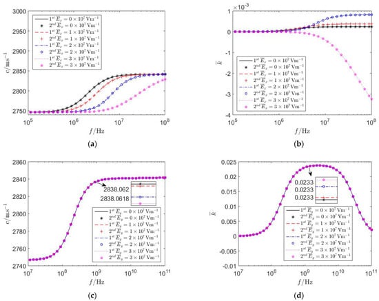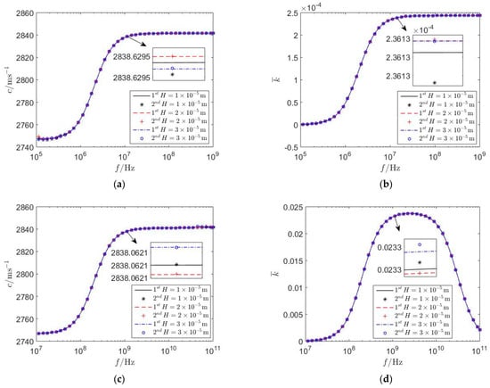 In this sub-section, the influence of the thickness of the upper PSC layer and biasing electric fields on the dispersion and attenuation characteristics of Love waves is systematically discussed. The acceptor concentration in the upper n-type PSC layer or lower n-type PSC substrate is and the donor concentration in the lower p-type PSC substrate or upper p-type PSC layer is also . Figure 10 and Figure 11 show the dispersion and attenuation curves of Love waves with the variations in the thickness of the upper PSC layer and biasing electric fields, respectively. It is also observed that the discrete numerical points calculated using the second mathematical model fall approximately on the continuous curves using the first mathematical model regardless of the variations of , , and , which further verifies the equivalence of the above two mathematical models and the effectiveness of the interface characteristic lengths. It is observed that the variations of and have negligible influence on the dispersion and attenuation curves of Love waves, while the variation in has an evident influence on the dispersion and attenuation curves of Love waves. This is because the direction of is the same as the propagation direction of Love waves, as shown in Figure 1, which means that the dispersion and attenuation characteristics of Love waves can be modulated using the biasing electric field parallel to the PN junction. It is further observed from Figure 11b that the dimensionless attenuation coefficient of the Love wave gradually becomes negative with an increase in when , which implies that the wave motion energy of the Love wave no longer decays but gradually increases. This physical phenomenon is called the acoustoelectric amplification effect [32,33,34]; that is, the energy of the biasing electric field is converted into the wave motion energy of the Love wave due to the semiconductor effect, which can be utilized to design acoustoelectric, energy harvest and conversion devices [9,10,11,12].