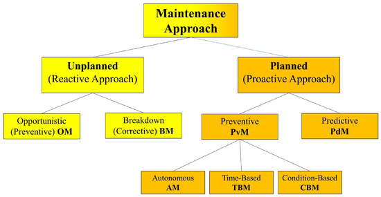 The most basic method of equipment maintenance is unplanned maintenance (UM) (see Section 2.2.1 and refer to the yellow left branch of Figure 1). Planned maintenance (PM) (see the right orange branch of Figure 1) includes various aspects of planned maintenance interventions, divided into two main strategies: preventive maintenance (PvM) (see Section 2.2.2) and predictive maintenance (PdM) (see Section 2.2.3).