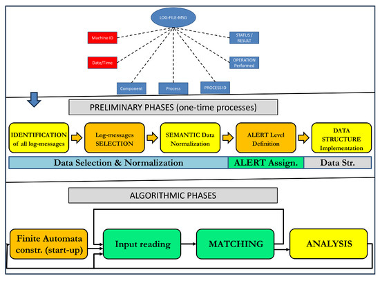 In the first sub-step, the task involves identifying, selecting, and normalizing all relevant log messages from the individual data source. Subsequently, each identified message is associated with its corresponding alert level. This association aids the algorithm in proactively identifying potential machine malfunctions. Finally, the third sub-step entails constructing the computer data structure utilized by the algorithm.