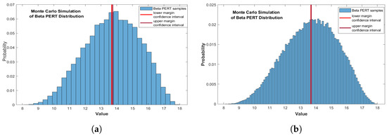 Using the minimum , maximum value and the expected value min (see [25] (Table 2) for the SE/range and the expected value), the most likely value is obtained. The Beta PERT distribution that models the primary treatment cost is MC simulated and depicted in Figure 6a for number of samples, with a confidence interval , and in Figure 6b for , with a confidence interval of obtained for () significance.