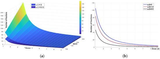 Number of fractions (n) as a function of dose and BED. (a) n(Dose,BED). (b) n(dose,BEDmean), BEDmean = 139.985.