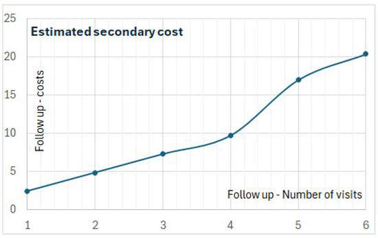 According to [24], the follow up cost per visit is EUR 97 and the number of follow-up visits for the first year and second year is a Gamma distribution with expected values of 4, and 2, respectively. Using MC simulations for the two cases, confidence intervals are obtained with probabilities depicted in Figure 8 and used to compute the secondary treatment costs, which include the costs of the probabilities of return in the first and second years.