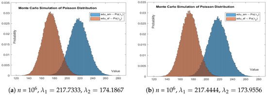 Figure 13 shows MC simulations of the additional income obtained from the education part for the two last periods; the two parameters and are computed from , with for Figure 13a and for Figure 13b.
