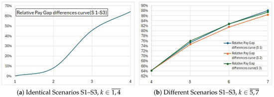 Figure 14 is dedicated to the accumulated income differences for the first four periods and for the last three. The three scenarios are identical for the first 2 years. Scenario () maintains the same delta 1 increase until the end of the analyzed time period, scenario () differs from () by changing the percentage of increase in , and scenario 3 additionally takes into account wage increases depending on education.