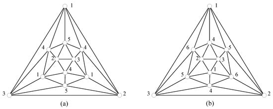 It can be checked that is a planar graph of order . Note that every three-coloring of the exterior triangle of can be extended to a fall five-coloring by Figure 2a or a fall six-coloring by Figure 2b of . We can recursively obtain a fall five-coloring and a fall six-coloring of . Hence, for any integer i, is a planar fall k-colorable graph for . □