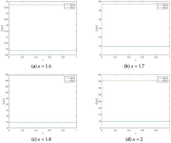 Firstly, we test the discrete mass conservation law. Figure 1 gives the evolution of mass Qn and energy En for 1.6, 1.7, 1.8, 2, respectively, with = h = 0.01.