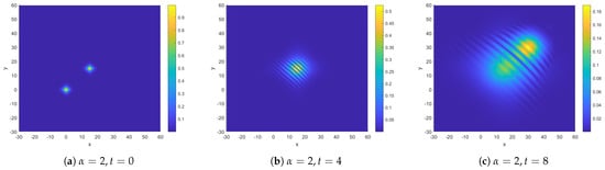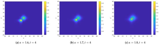 Now, we investigate the impact of the collision of two solitons brought by fractional order. In this example, we compute the interaction between two solitons. Take and in (1). The initial conditions are given as follows: In order to illustrate the fact clearly, we first specify the elastic collisions with . It can be observed that the waves retain their shape and velocity after interaction (see Figure 2). Then, we choose different α to test the collisions of two solitons. Figure 3 shows the evolution of the modulus of the collision at for , respectively. We can find that the order α will greatly affect the collision time. The smaller α becomes, the longer the collision time. Generally, a reduction in the order may indicate a stronger memory effect in the system, leading to a slower interaction between isolated solitons. This feature is consistent with the fact that the fractional order introduces more historical information.