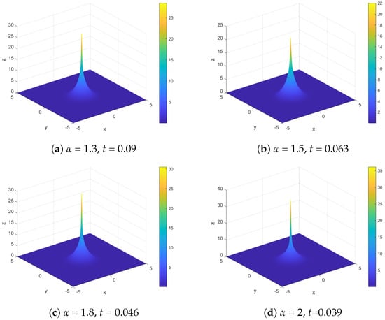 The solutions of the nonlinear Schrödinger equation can exhibit a phenomenon known as ‘blow-up’. In this example, we show the singular solutions for the FNLS equation. We choose and in (1). The initial condition is . Figure 4 shows the modulus of the solution with different fractional order, . The blow-up effect is obtained in finite time with different α. These plots show that the blow-up time becomes smaller for progressively increasing α. This is because the fractional-order derivatives introduce a dependence on the system’s past states, causing the evolution of the system to be influenced by previous states over longer distances.