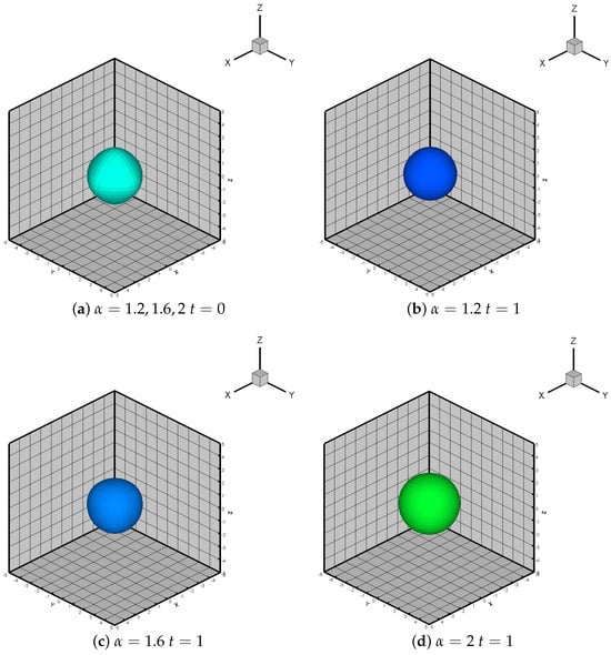 Finally, we consider the 3-D problem (1) in , with . We set the final computation time as t = 1. The initial conditions are . To better illustrate the results, Figure 5 describes the time evolutions of solitons. Figure 5a shows the initial solution with the isosurfaces . Figure 5b–d demonstrate the solution of , where the fractional orders are chosen as and 2. It can be seen from the figure that the order α will greatly affect the soliton. The soliton propagates at a slower speed when α decreases.