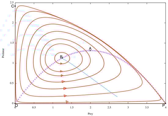 The stability of the internal equilibrium point (x0,y0) depends on e and, therefore, on its position along the parabola. It is stable from P (i.e., for small e) up to a certain point, B, in the paradoxical region, as shown in Figure 1, where there is a PAH bifurcation (equaling Poincaré–Andronov–Hopf, often referred to as Hopf bifurcation, see for example [6,7]). Equilibrium still exists in the BO arc but it is unstable, with the attractor being a periodic cycle surrounding the equilibrium point. This cycle naturally depends on e; we have drawn it on Figure 1 for several values of e. The literature is very rich in these problems of equilibria cycles, see for example [8,9,10,11] and references cited therein.