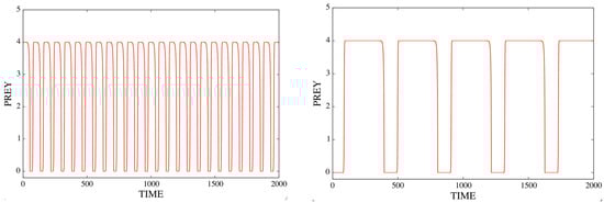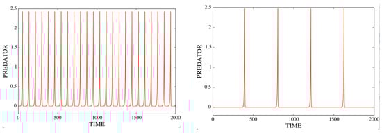 In the previous example, it is sufficient to reduce a little further the value of (from 0.8 to 0.55) to destroy the replacement of by Instead, the two predators cohabit (in addition to the prey) in an internal stable cycle. This is an example of the persistence of two predators with a prey, see [5,14,15,16] or Chapter 10 of [1] for more on this interesting subject. Naturally, this type of solution cannot exist in the cycle-free region (i.e., with e small enough to be below the PAH bifurcation); see Figure 7c,d.