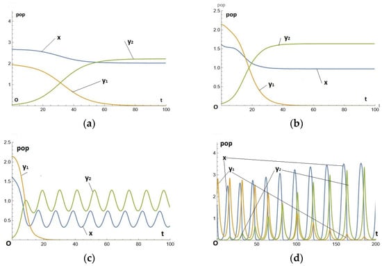 We take so that the two predators differ only in efficiency (that of being greater than that of ). It is easy to check that they are both in the normal region (the arc of the parabola between P and A: as e increases, the equilibrium population of prey decreases and that of predators increases). We then calculate the solution of Equation (7) starting from initial values such that x(0) and are very close to the equilibrium position of the system without ; indeed, we start from the initial condition (2.68,1.94, and 0.05). The numerical solution is shown in Figure 4a.