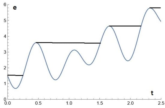 Instead of the straight-line e(t) = 0.145 + εt used above, we can advantageously use another e(t) function of the proposed evolution, such as the one proposed in the other allegorical figure below (which is a regular curve with relative maxima and minima; Figure 6). The time will appear to pass very slowly, so that we can consider the state of the system as a sequence of asymptotic states on the attractor (in the particular case where the attractors are points, we say it is a quasi-static evolution). By taking a larger b, the onset of cycles is delayed.