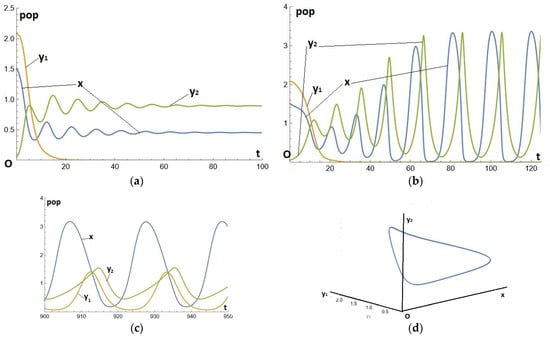 (a). Temporal series for system (1)–(2)–(3), where the parameters are given by Equation (18); (b). Temporal series x(t), y1(t), and y2(t) for system (1)–(2)–(3), where the parameters are given by Equation (18), except for ; (c,d). Solutions for system (1)–(2)–(3)(1)–(2)–(3), where the parameters are given by Equation (18), except for . (c) Temporal series (t,x), (t,y1), (t,y2). (d). The limit cycle in the (x,y1,y2)-space.