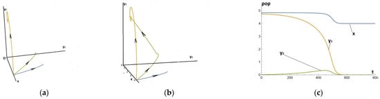 Predation–commensalism system (1)–(2)–(3), with a capacity of the medium P as a function of x given by Equation (19). In the case of two competing predators, the system is Equation (7) with Equation (20). The parameter values are given by Equation (21): (a) shows three orbits in space starting from points close to the equilibrium of the prey alone with ; the third orbit starts from (4, 0.04, 0.02); (b) with (instead of 0.45); (c) with λ1 = 2.2, λ2 = 0 and e2=0.101 (instead of λ1 =0.25, λ2 =1.25 and e2 =0.18).