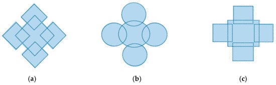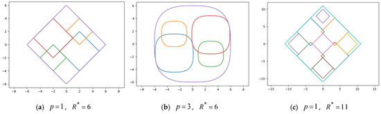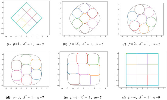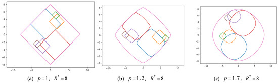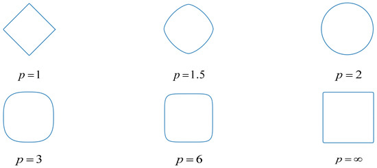 For different , Lp norms generate different convex shapes of spheres in and , e.g., diamonds (rhombuses), spheres (circles), objects with “round” angles, and cubes (squares) [39]. Figure 2 illustrates some shapes of unit spheres in for and .