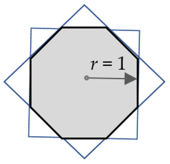 For example, for and , the unit sphere has an octagonal shape, an intersection of a square and a rhombus (diamond). Especially for , the regular octagon is obtained (Figure 3).