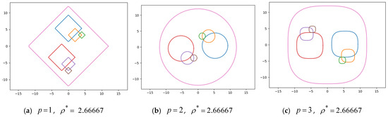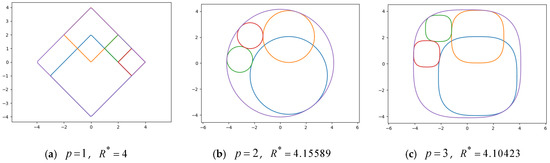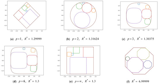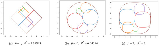 These problem instances present irregular objects composed by spheres defined in Lp norms. The following dataset was considered: , , , . The best solutions obtained by BARON within 600 s. are presented for different values of in Figure 11.