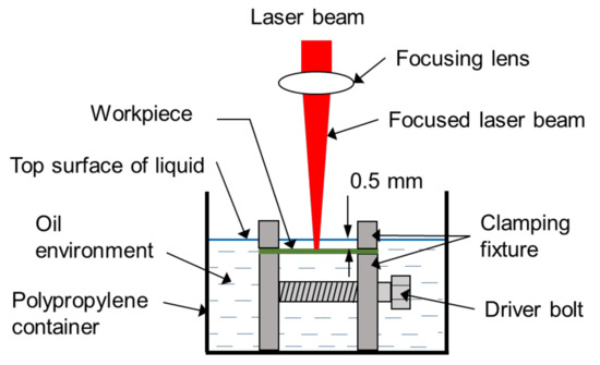 All experiments took place in paraffinic oil, using a laser configuration consisting of a 20 W pulsed fiber laser system, a laser beam expander, a scanner, and a focusing lens. The laser functioned at a wavelength of 1064 nm, with a pulse frequency varying from 20 to 80 kHz, and a pulse duration of 100 ns. It was focused on a spot measuring 50 μm in diameter on its focal plane. Information regarding the laser system and experimental arrangement was given elsewhere [11]. Thin non-oriented silicon steel sheets, 0.1 mm thick (ST-100, Nikkin Denji Kogyo Co., Ltd., Saitama, Japan), were employed in the study. The experiment involved cutting a 90-degree arc path with radii of 1 mm, 3 mm, and 5 mm using different combinations of laser process parameters. Figure 1 depicts the schematic diagram illustrating the arrangement of the workpiece and environment for laser cutting.