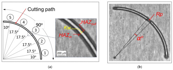 Four indices were used to evaluate cut quality, namely, kerf width (Kw), inner HAZ (HAZin), outer HAZ (HAZout), and re-welded portion (Rp). The dimensions of Kw, HAZin, and HAZout are defined and schematically shown in Figure 2a. The dimensions of Kw, HAZin, and HAZout were measured for each sample at 5 locations as illustrated in Figure 2a, and their averages were used as the resulting cut qualities for each sample. The description of Rp is schematically shown in Figure 2b. Note that Rp = α°/90°, where α° is schematically defined in Figure 2b. The Kw, HAZin, and HAZout were identified through visual examination, employing a method identical to that utilized in [4], which was subsequently verified through microstructural analysis.