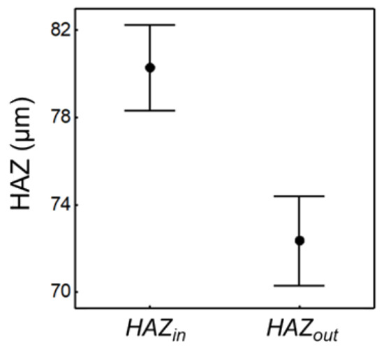 Figure 11 illustrates the comparisons of kerf width (Kw) and HAZ between curved cuts and straight cuts, utilizing the optimal process settings. Figure 11a demonstrates that the average Kw of the straight cut was somewhat less compared to the curved cut. The interval plots of the curved cut in Figure 11b clearly demonstrate that HAZin is considerably greater than HAZout. This aligns with the information presented in Figure 4. However, the interval plots in Figure 11b indicate that there are no notable distinctions between HAZleft and HAZright. The difference in HAZ between straight and curved cuts can be attributed to specific effects of beam trajectory in curved laser cutting. These effects include uneven distribution of beam energy, concentrated bulk heating of the material, as well as heat conduction converging near the center of rotation and diverging away from it [39].