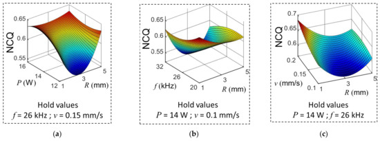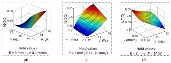 Response surface plots of NCQ for various pairs of variables: (a) R and P, (b) R and f, (c) R and v, (d) P and f, (e) P and v, and (f) f and v.