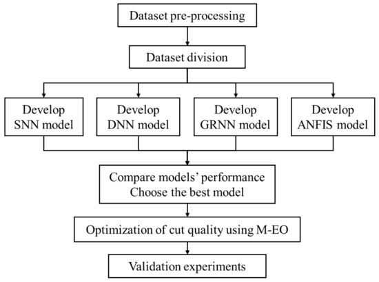 This work involved the development of four AI-based models, specifically SNN, DNN, GRNN, and ANFIS, for the purpose of predicting cut quality. These models utilized laser process characteristics as inputs. The main goals of creating these four models were to assess their effectiveness and determine the most suitable model for accurate predictions of cut characteristics in the given laser processes. A comparative analysis was conducted to establish the optimal model performance. The most superior model was subsequently employed as the objective function in M-EO optimization to acquire the ideal process parameters that result in the highest grade of cut. Figure 7 illustrates the overall process of using AI-based modeling to predict and optimize the quality of the cut. Specifics of each stage are detailed below. The SNN, DNN, GRNN, ANFIS, and M-EO models were created using Python 3.9 code.