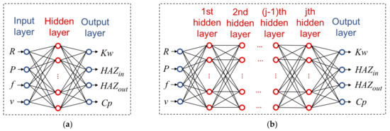 An SNN refers to a type of ANN that has a feed-forward structure with only one hidden layer [28]. On the other hand, a DNN, which is also a feed-forward ANN, has several hidden layers [28,29]. Figure 8 provides a schematic representation of the overall architecture of SNN and DNN, which are both built using the Keras framework. The input variables included R, P, f, and v, whilst the output variables encompassed Kw, HAZin, HAZout, and Cp. Here, Cp denotes the clean-cut portion, which is determined using the formula Cp = 1-Rp. The hidden neurons utilized the rectified linear unit (ReLU) activation function, while the output neurons employed the sigmoid activation function. ReLU is preferred for hidden neurons due to its simplicity and effectiveness. It addresses the vanishing gradient problem, leading to faster convergence during training. By setting negative input values to zero, ReLU introduces non-linearity, facilitating efficient learning of complex patterns in hidden layers [30]. Using the Sigmoid activation function for output neurons in this application scales the output values between 0 and 1, suitable for representing probabilities or proportions. Sigmoid ensures the output values are bounded within this range, facilitating their interpretation. Additionally, Sigmoid’s differentiability supports optimization techniques like back-propagation, aiding in the efficient adjustment of weights and biases during the learning phase [31]. Such choice enhances convergence and training stability in both the SNN and DNN architectures described. The AI-based models were constructed by randomly dividing the datasets into training, validation, and testing sets. The back-propagation algorithm was used to make adjustments to weights and biases during the learning phase, following the Adam optimizer technique.