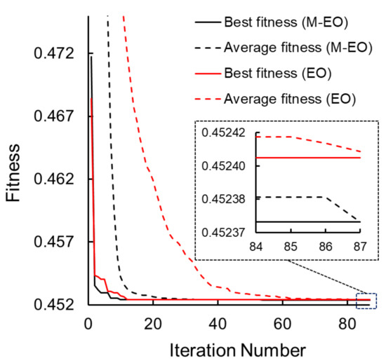 In the optimization process for enhancing cut quality, the population comprised 200 particles, with a maximum number of iterations of 500. The variables including R, P, f, and v were confined within specific ranges: 0.5–6 mm, 11–18.6 W, 20–40 kHz, and 0.05–0.3 mm/s, respectively. Each particle’s fitness was determined using the NCQ formula (Equation (1)). Subsequently, the 5-hidden-layer DNN was integrated with the M-EO to identify the optimal process parameters. Figure 10 illustrates the optimal and average fitness levels of all particles throughout each iteration. The evolution of fitness depicted in Figure 10 indicates that M-EO outperforms EO in attaining the equilibrium state, and the solutions obtained through M-EO are superior to those of EO. These outcomes underscore the enhancements achieved by the developed M-EO.