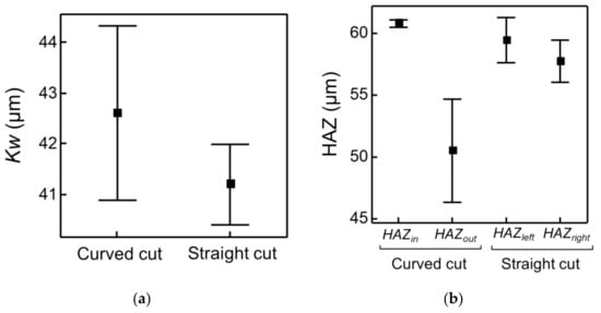 Interval plots illustrating (a) Kw and (b) HAZ for curved and straight cuts in laser cutting employing the optimal process parameters.