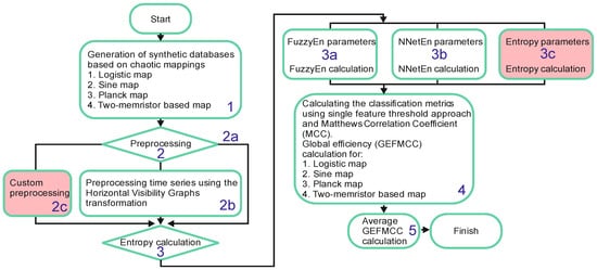 Before calculating an entropy function, several parameters should be initialized, for example, embedding dimension m, tolerance threshold r, and time series length N. Although these parameters are critical for calculations, there are no guidelines for optimizing parameter values, as there is no generally accepted fitness function. Several authors have conducted research on optimal parameters and types of entropy [24,25,26,27,28], and this research does not claim to be general. The conclusions are of a local nature, characterized by the time series databases and the entropies used. A wide variety of entropies exists: the EntropyHub Guide lists 18 types of entropies [29,30], and the review by Ribeiro et al. [31] compares 40 types of entropies for various areas of application and coins the term “The Entropy Universe”. In this context, it is important to assess the effectiveness of the different entropies when used as features in ML classification. In the current study, we assume that global entropy efficiency can be calculated on model time series generated by chaotic mappings. The method includes a wide range of time series with different dynamics, and the calculated entropy efficiency value (GEFMCC) can be considered a global entropy characteristic for time series classification problems. The GEFMCC’s value is as a fitness function for optimization problems when searching for the best entropies for time series classification problems. We present a Python implementation for calculating the generalized efficiency of FuzzyEn and NNetEn entropy for user-specified parameters. Using this method, it is possible to not only rank the existing entropies, but also evaluate the effectiveness of new types of entropies for time series classification problems.