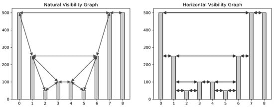 The natural visibility graph (NVG) was introduced in [32] as a simple and computationally efficient method to represent a time series as a graph. Visibility graphs preserve the periodic and chaotic properties of the discrete map [32]; see [33,34,35]. For example, periodic series result in regular graphs, random series in random graphs, and fractal series in scale-free graphs. Horizontal visibility graphs (HVG) were introduced in [32] to simplify the previously described NVG. Visibility graphs (VG) reduce the complexity of calculations, which depends on time series, while preserving the accuracy of the results; see [36,37,38].