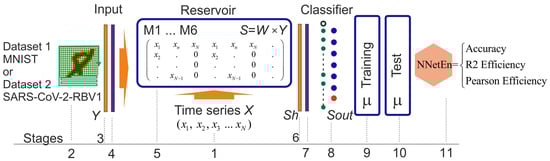 Main steps of NNetEn calculation [1]. The figure shows the main stages of calculation NNetEn based on the reservoir neural network LogNNet, where the reservoir is filled with the time series under study, and the entropy value is proportional to the classification metric of the reference database.