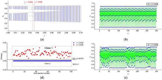 Section of the buffering diagram of the logistic map, on which two adjacent sets of series are highlighted corresponding to rj−1 = 3.634 and rj = 3.636 (a), series (x1, …, x300) for rj−1 = 3.634 (b), series (x1, …, x300) for rj = 3.636 (c), and FuzzyEn values for 100 time series for two classes (MCC = 1) (d). The figure explains the method for calculating the classification metric for the time series of a discrete map for neighboring sets corresponding to two neighboring partitions by r.