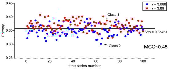 As a result, we compiled a database with two classes. Class 1 contains 100 entropy values of time series generated at rj = 3.636, and Class 2 contains 100 entropy values generated at rj−1 = 3.634. To classify the two classes, we will use the threshold model.