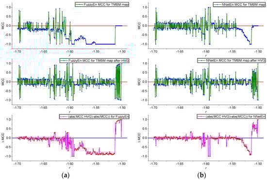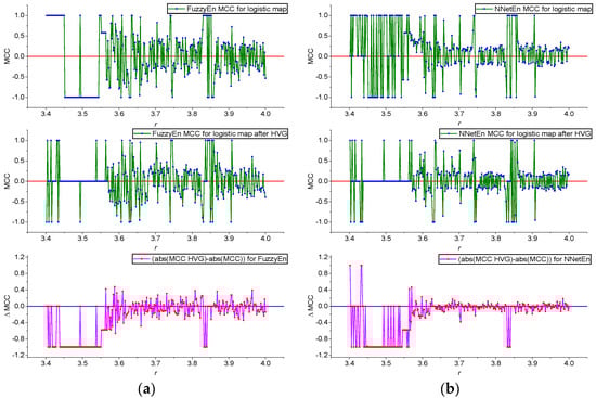 MCC(r) dependences for FuzzyEn before and after HVG transformation, as well as their difference in ΔMCC (a); MCC(r) dependences for NNetEn before and after HVG transformation, as well as their difference in ΔMCC (b). Calculations were made for Planck map.