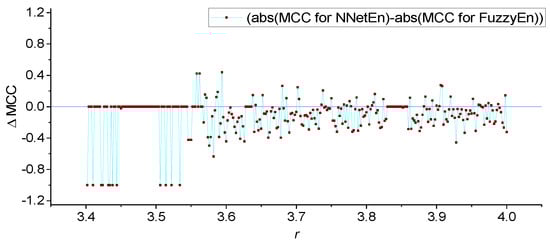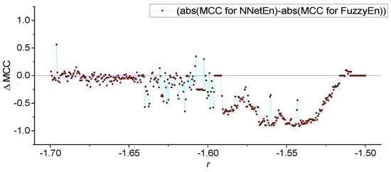 - A comparison of the effectiveness of FuzzyEn (m = 1, r = 0.2∙d, r2 = 3, τ = 1) and NNetEn (D1, 1, M3, Ep5, Acc) was investigated. FuzzyEn is shown to have improved GEFMCC in the classification task compared to NNetEn. At the same time, there are local areas of the time series dynamics in which the classification efficiency NNetEn is higher than FuzzyEn. The Matthews correlation coefficient was used to evaluate binary classification.