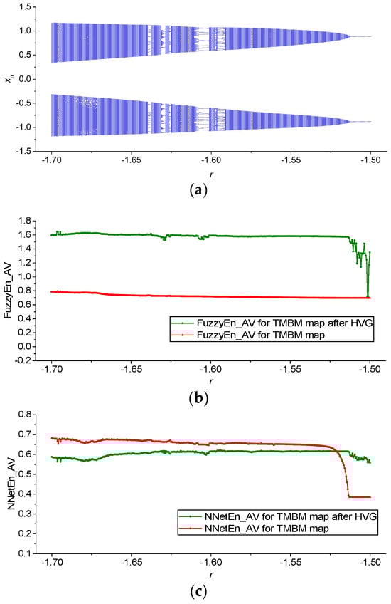 Bifurcation diagrams for Planck map (a); the dependence of entropy on the parameter r for NNetEn_AV (b); and FuzzyEn_AV before and after HVG transformation (c). The figures show changes in the dynamics and irregularity of time series depending on the parameter.