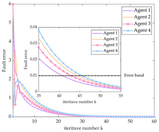 After selecting an appropriate learning gain, with the initial parameter set to , analysis and calculations reveal that these parameters satisfy the conditions of Theorems 1 and 2. Meanwhile, assuming the occurrence of fault in MAS (37), it is specified as follows: