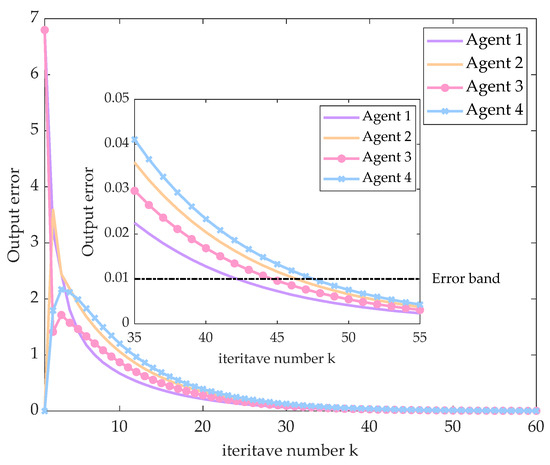 Figure 5 and Figure 6 present curves depicting the variations in the fault error and output error in MAS (37) with the iteration count, respectively. Figure 7 and Figure 8 present curves depicting the variations in the actuator fault error and output error with the iteration count, respectively. According to the varying curves in Figure 7 and Figure 8, it can be observed that the fault errors and output errors of the four actuator agents gradually converge along the positive direction of the iteration axis. To further observe the variations in these errors, localized zoom-in plots are provided for each of them in Figure 7 and Figure 8, respectively. By the 50th iteration, the fault errors and output errors of all actuator agents can enter the preset error band of 0.01. Therefore, Figure 7 and Figure 8 show that with an increase in the number of iterative learning cycles, the fault estimation in the actuator agent’s estimator gradually converges to the actual fault, and the output also tends to approach the actual output.