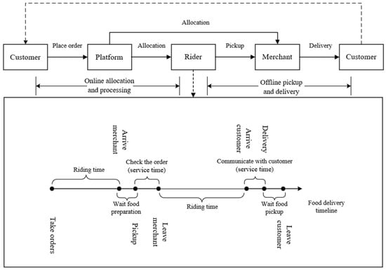 The service process of takeout can be broadly categorized into two stages: online order allocation and processing and offline order pickup and delivery, as illustrated in Figure 1. In the first stage, customers peruse the menu details provided by merchants and place orders via online delivery platforms. The platform then sends an application for order acceptance to the merchant. Upon confirmation by the merchant, the platform allocates the order to a rider based on its order allocation system. Simultaneously, the merchant initiates food preparation and awaits the arrival of the designated rider for food pickup. In the second stage, the rider receives this order from the platform and from the distribution center and proceeds to the corresponding merchant for food pickup. After completing the pickup, the rider adheres to a specified timeframe to deliver the food to the customer’s location, thereby accomplishing the overall comprehensive service process of this order.