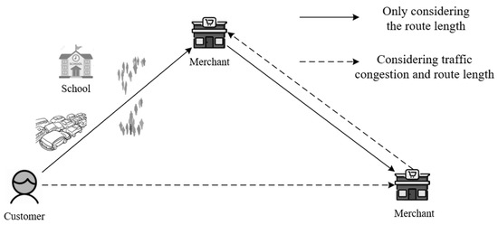 Delivery vehicles navigate through the urban road system, which exhibits time-varying subdivision network characteristics during the delivery process. Urban roads have a large traffic flow and many intersections, which often cause traffic congestion due to rush hour and road construction. These factors result in changes in road speed within different time periods, reflecting the typical characteristics of time-varying road networks. These characteristics affect the pick-up and delivery time of takeout food. Moreover, urban road networks can be categorized into expressways, main roads, secondary roads, and branches. The predominant delivery vehicles in these areas are electric bicycles, primarily operating on secondary roads and branches. These characteristics of the subdivision road network influence the selection of driving routes by delivery vehicles, consequently impacting pick-up and delivery times. However, the existing studies on static [1,2,3,4,5,6,7,8,9,10,11,12,13,14] and dynamic [17,18,19,20,21,22,23,24] takeout delivery have not considered the time-varying subdivision road network conditions during the driving process of takeout vehicles. Therefore, these research findings fail to adequately consider selecting optimal routes based on varying congestion levels of different roads, thereby impacting both the actual delivery time of takeout orders and customers’ dining experience.